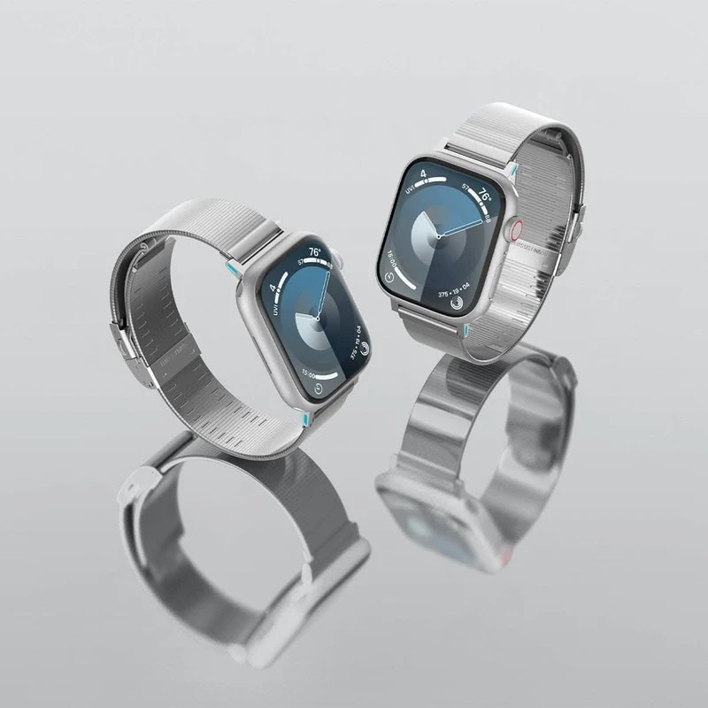 ✔ اتصال دقیق و کاملاً سازگار با بدنه اپل واچ بدون لقی, ✔ رنگ نقره‌ای با پرداخت ظریف و ظاهری لوکس ., ✔ سازگار با اپل واچ در سایزهای ۴۲، ۴۴، ۴۵ و ۴۹ میلی‌متری و Watch SE ۳ (۴۵mm) ., ✔ وزن متعادل برای استفاده طولانی‌مدت بدون ایجاد خستگی روی مچ .