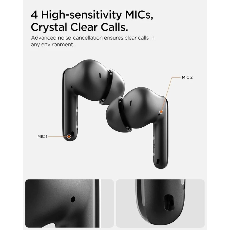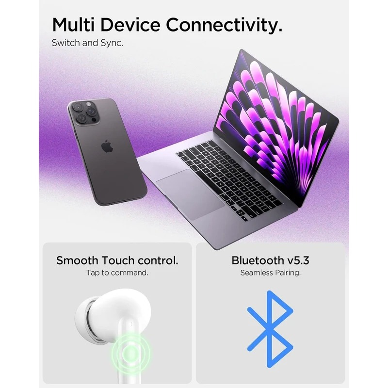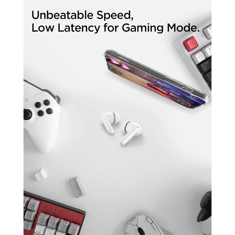 ✔ حالت بازی – تجربه بازی با تأخیر کم: حالت ویژه بازی با تأخیر کم، تفاوت بین صدا و تصویر را به حداقل می‌رساند. بنابراین می‌توانید نشانه‌های صوتی فوری را بدون تأخیر در بازی‌های رقابتی ضبط کنید., ✔ صدای قابل تنظیم: با برنامه Spigen Audio که دارای ۵ پروفایل صدای از پیش تعیین شده و یک اکولایزر قابل تنظیم برای مطابقت با تنظیمات منحصر به فرد شماست، تجربه شنیداری خود را ارتقا دهید., ✔ لذت گیمرها: با انتقال صدای شفاف و کم‌تاخیر برای یک تجربه بازی بدون وقفه، در دنیای مجازی خود غرق شوید., اتصال بی‌وقفه: با فناوری پیشرفته بلوتوث ۵.۳، جفت شدن بی‌دردسر و اتصال پایدار را تجربه کنید.
