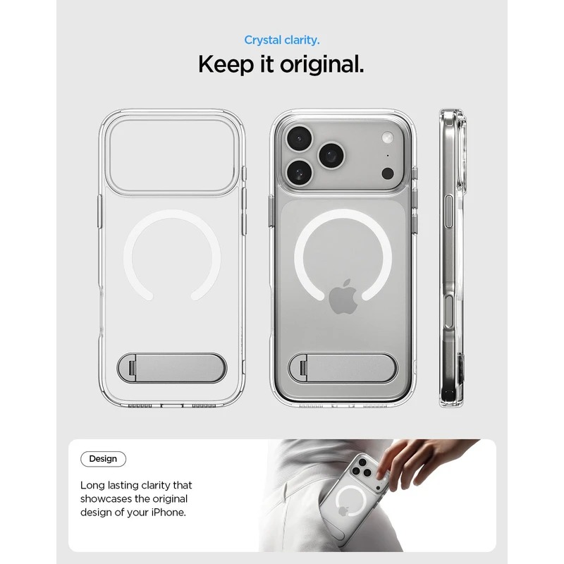 قاب **Spigen Ultra Hybrid S (MagFit)** برای سری آیفون 17 طراحی شده تا ترکیبی از جلوهی شفاف و محافظت قابل اعتماد رو کنار هم داشته باشه. بدنهی این کیس از ترکیب پلیکربنات سخت (PC) و TPU نرم ساخته شده که مقاومت در برابر ضربه و خراش رو افزایش میده؛ در لبهها از فناوری Air Cushion استفاده شده تا شوکهای ناگهانی رو خنثی کنه. همچنین این قاب دارای حلقه مگسیف جدیده (MagFit) که امکان استفاده راحتتر و محکمتر از لوازم جانبی مگسیف را فراهم میکند. بریدههای دقیق در قسمت دوربین باعث شده دوربین حالت برجستهاش دست نخورده بمونه و عکسبرداری با کیفیت امکانپذیره. دکمهی کنترل دوربین با لایهی نازک TPU پوشونده شده که هم محافظت میکنه هم عملکرد رو محدود نمیکنه. علاوه بر اینها، کیس دارای پایه (kickstand) گردان داخلیه که وقتی باز میشه میتونی گوشی رو به صورت تخت نگاه داری و فیلم دیدن یا تماس تصویری راحتتر بشه و وقتی بستهست کاملاً مسطح هست تا جلوهی مینیمالیسم حفظ بشه. شفاف بودن مواد استفادهشده باعث میشه طراحی اصلی آیفون دیده بمونه، و قابلیت شارژ بیسیم همراه با لوازم جانبی مگسیف رو داره.