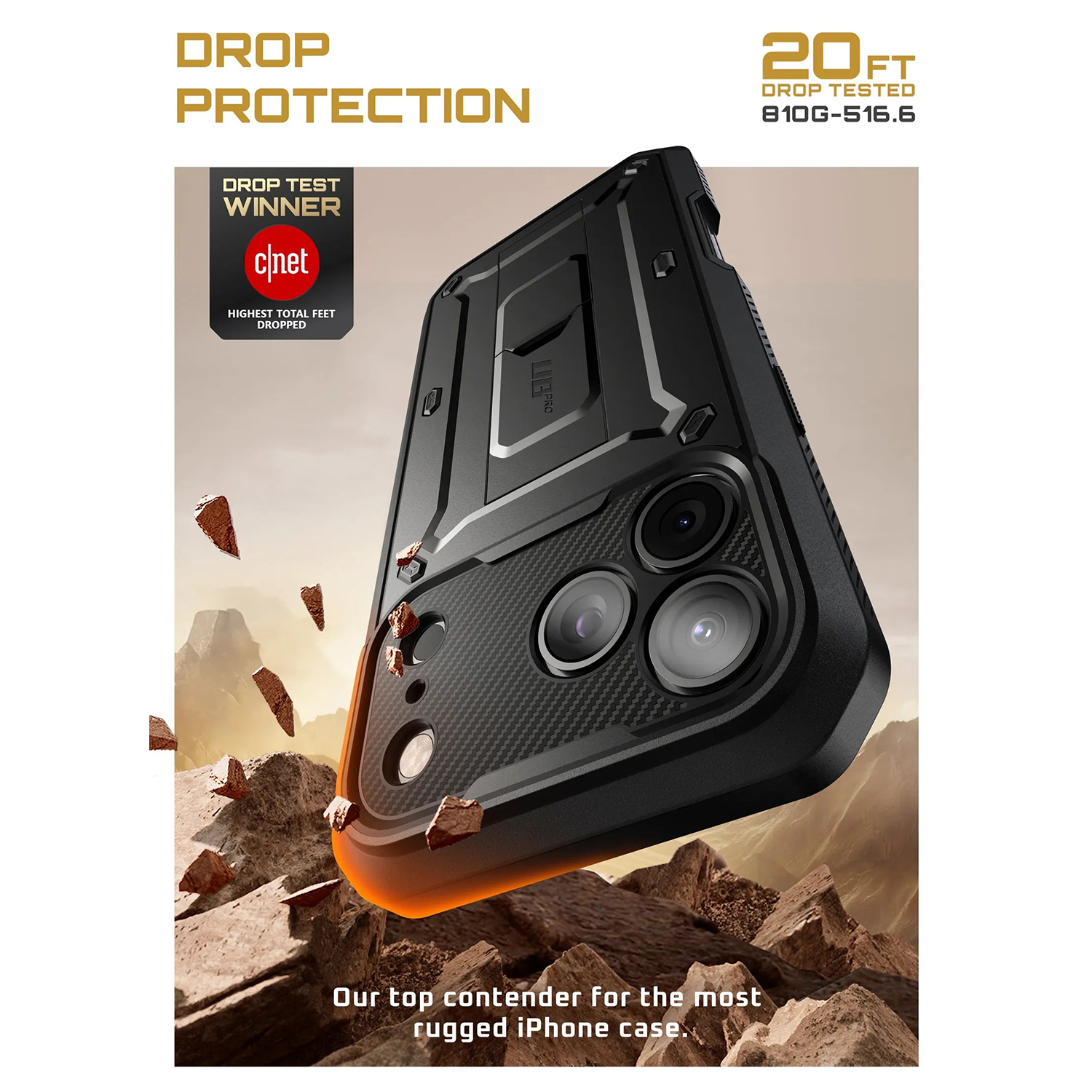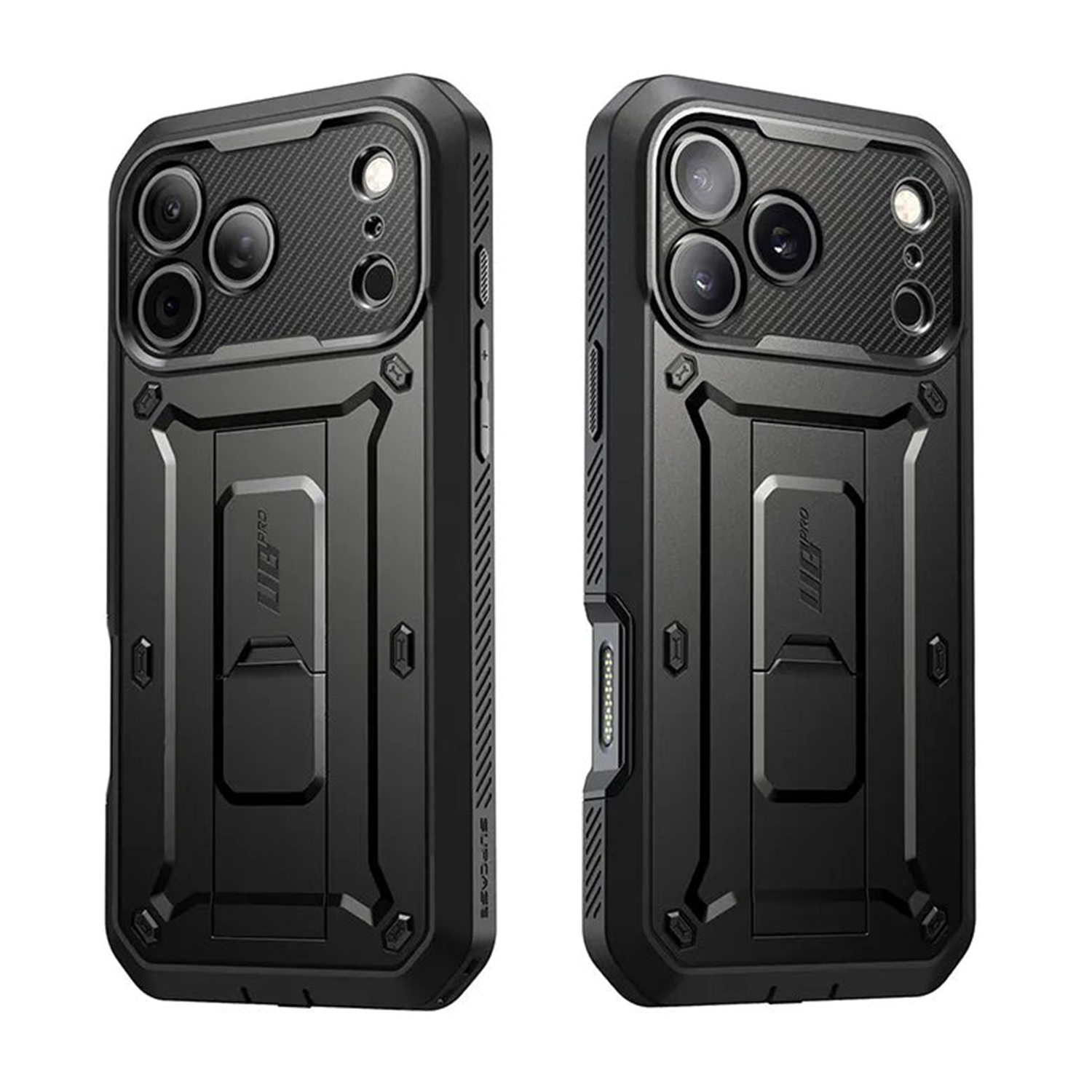 کاور محافظ SUPCASE Unicorn Beetle Pro برای آیفون 17 پرو مکس طراحی شده است تا حداکثر محافظت و کارایی را برای دستگاه شما فراهم کند. این قاب با طراحی چندلایه و ترکیبی از پلیکربنات سخت و ترموپلاستیک نرم (TPU) بهطور مؤثر ضربات را جذب کرده و از گوشی شما در برابر سقوطها محافظت بعمل می آورد. علاوه بر این، قاب مطابق با استاندارد MIL-STD-810G 516.6 تست شده و مقاوم در برابر سقوط از ارتفاع ۲۰ فوت (حدود ۶ متر) است، که این امر امنیت گوشی شما را در شرایط مختلف تضمین مینماید. این محصول همچنین دارای محافظ صفحه نمایش یکپارچه است که از خراشیدگی صفحه نمایش جلوگیری در حالیکه حساسیت لمسی آن را کاملا حفظ میکند. در مواقعی که تماشای ویدیوها یا تماسهای تصویری بدون نیاز به دست لازم است، این قاب به یک پایه نگهدارنده (کیکاستند) مجهز گردیده که کارایی را دو چندان میکند. علاوه بر این، کاور، دارای هولستر با گیره کمربندی ۳۶۰ درجه چرخان است که امکان حمل راحتتر و بدون نیاز به جیب را فراهم میکند. قاب SUPCASE Unicorn Beetle Pro همچنین بهطور کامل با MagSafe سازگار و دارای آهنربای N52 با نیروی مغناطیسی تا ۱۵۰۰ گرم است، که اتصال ایمن به لوازم جانبی MagSafe مانند شارژر بیسیم، نگهدارنده خودرو و جاکارتی مغناطیسی را امکانپذیر میسازد. طراحی دقیق قاب دسترسی آسان به تمامی پورتها، دکمهها و عملکردهای گوشی را فراهم می آورد. در نهایت، ظاهر صنعتی و آیندهنگرانه این قاب با خطوط برجسته و متریال مقاوم، آن را به انتخابی مناسب برای استفاده در شرایط سخت تبدیل میکند.