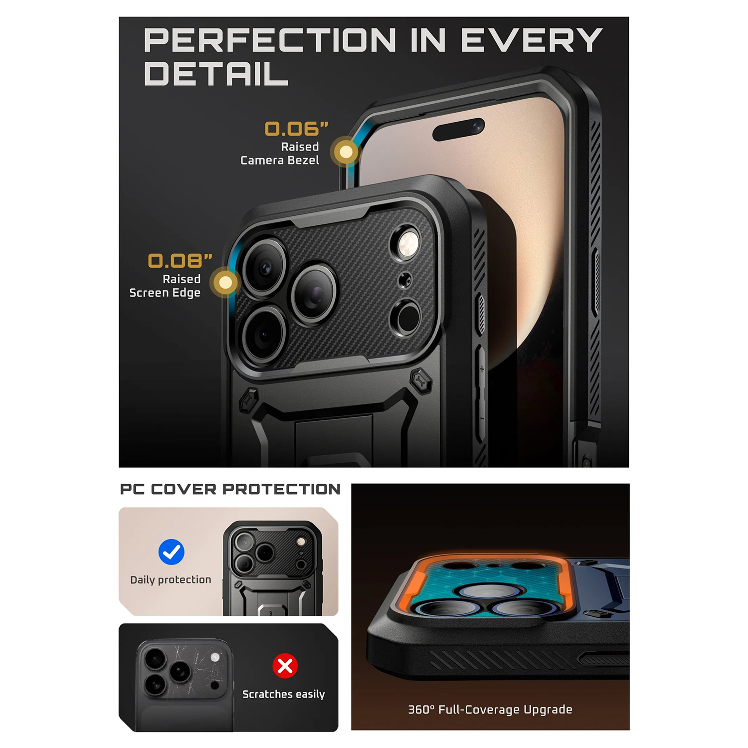 کاور گوشی ساپ کیس با پوشش 360 درجه گوشی از آسیب دیدن آن در مقابل ضربات شدید ، سقوط به خوبی جلوگیری کرده . پوشش بامپر TPU به همراه فیبر کربن بکار رفته در آن از دور تا دور گوشی محافظت نموده این پوشش به شکلی طراحی گردیده تا بتوان از دکمه ها و پورت ها به راحتی استفاده نمود. همچنین قسمت های برجسته تر قاب بدین جهت تعبیه شده اند تا نمایشگر و لنزهای گوشی در هنگام برخورد با سطوح یا سقوط و پرت شدگی آسیبی نبینند .