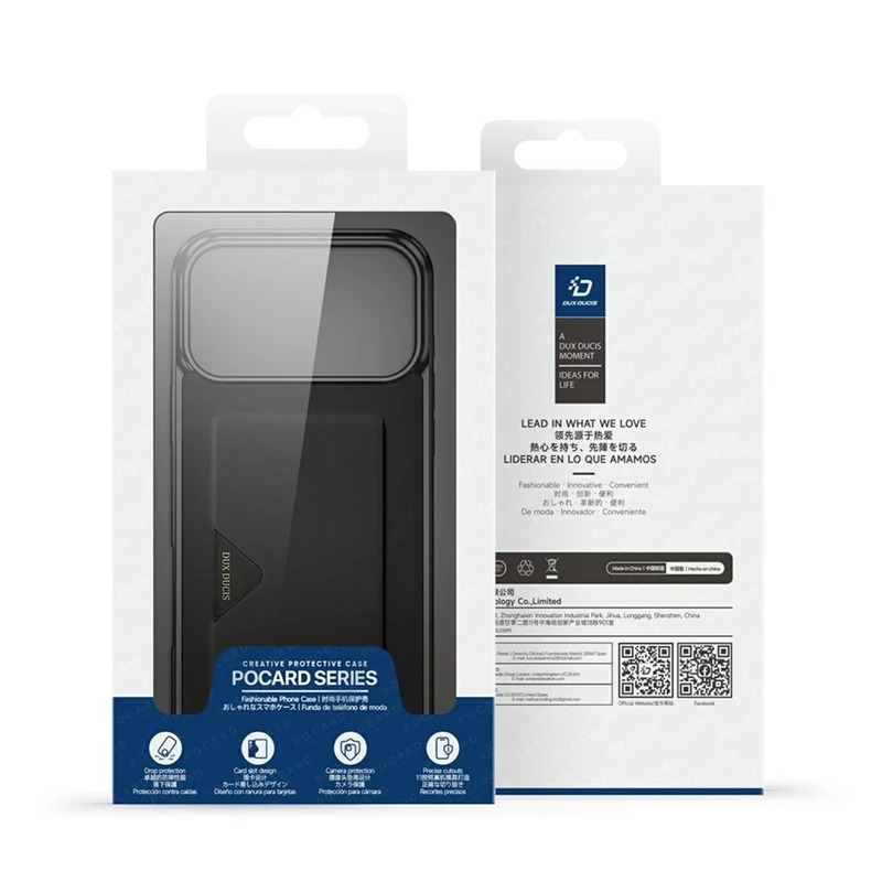 قاب DUX DUCIS Pocard Series برای iPhone 17 Pro Max طراحی باریک و سبک دارد که به‌خوبی پشت و لبه‌های گوشی را پوشش می‌دهد. سطح قاب در دو گزینه «براق (glossy)» یا «مات (frosted)» عرضه شده که ظاهری شیک و مدرن به دستگاه می‌بخشد. دکمه‌ها با طراحی ارگونومیک در دسترس‌اند و فیت دقیق برش‌ها امکان دسترسی راحت به پورت‌ها را فراهم می‌کند. لبه‌های قاب کمی برجسته هستند تا هنگام برخورد با سطح، از صفحه‌نمایش و دوربین محافظت بیشتری شود. این قاب به گونه‌ای طراحی شده که می‌تواند از شارژ بی‌سیم بدون نیاز به برداشتن آن پشتیبانی کند.
