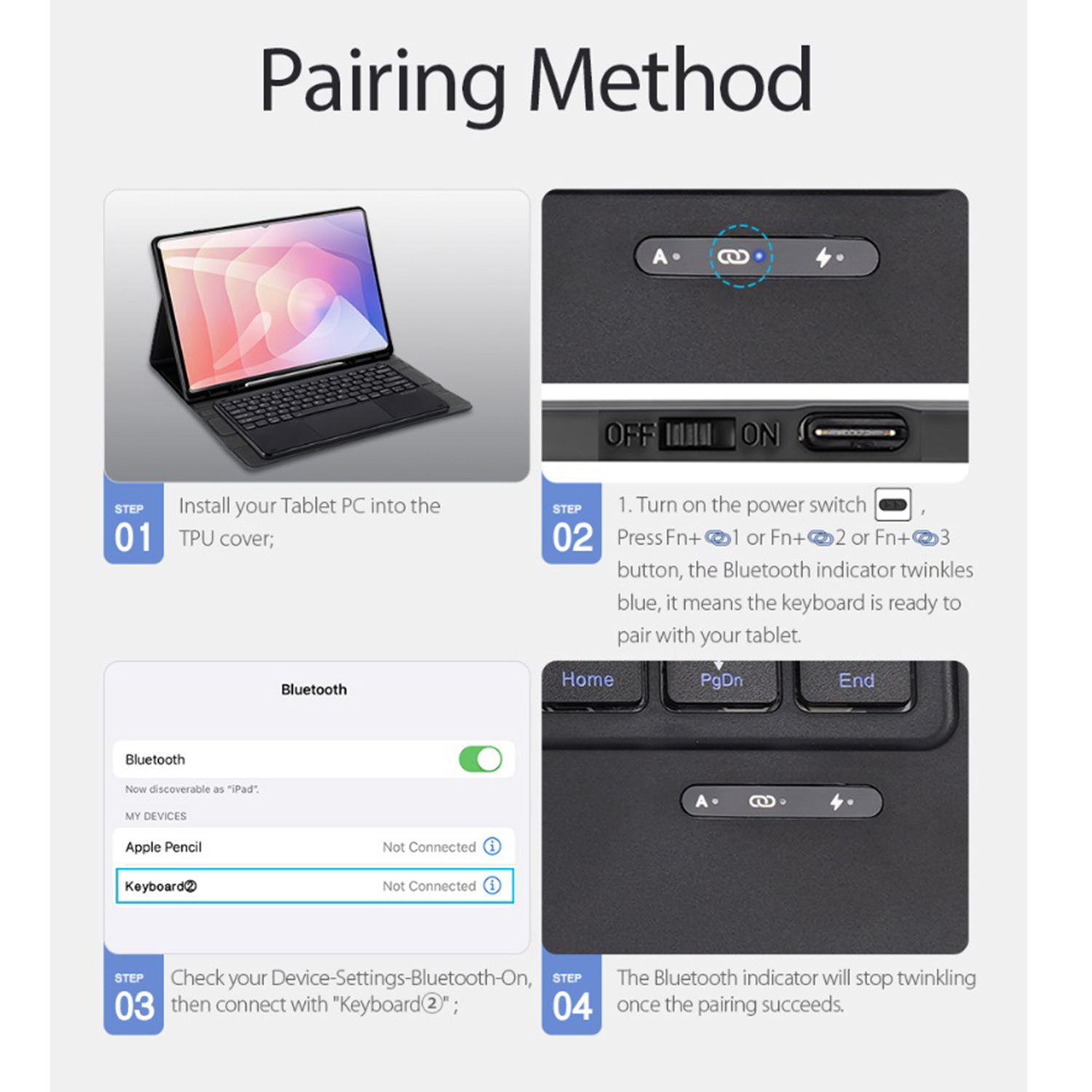 جهت اتصال به کیبورد حتما عکسی که در گالری تصاویر قرار داده شده را مشاهده نمایید . آموزش اتصال در تصویر درون گالری تصاویر قرار داده شده است . جهت اتصال به این دستگاه می بایست کلید پاور را روشن و سپس بعد از روشن و خاموش شدن چراغ های رو کیبورد کلید FN را به همراه کلید Q یا W یا E به صورت همزمان فشار دهید تا چراغ آبی چشمک زن روی کیبورد روشن شود . اکنون کیبورد در بلوتوث تبلت شما نشان داده میشود و شما می توانید کیبورد را به دستگاه متصل نمایید